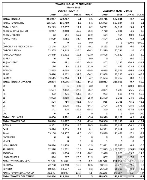 Toyota Motor North America today reported March 2019 sales of 214,947 vehicles, an increase of 0.1 percent on a daily selling rate (DSR) basis and a decrease of 3.5 percent on a volume basis versus March 2018.