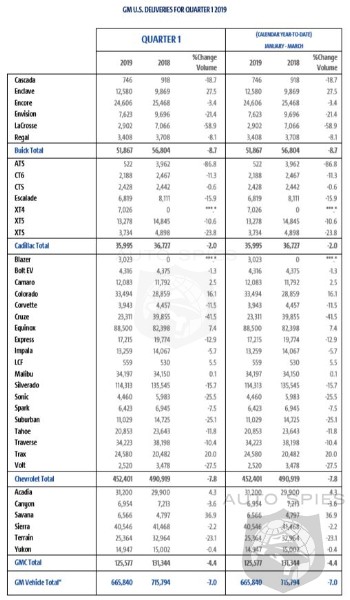 General Motors (NYSE: GM) announced today that it delivered 665,840 vehicles in the first quarter of 2019, with a selling mix of trucks, SUVs and crossovers above 80 percent. GM’s focus on these vibrant segments helped it earn the highest average transaction prices for any first quarter in the company’s history. The Chevrolet Trax, Equinox and Colorado all set GM first-quarter sales records and the GMC Acadia posted its best quarter ever. The all-new Cadillac XT4 was the best-selling vehicle in its segment and the Buick Enclave was up 28 percent versus a year ago.