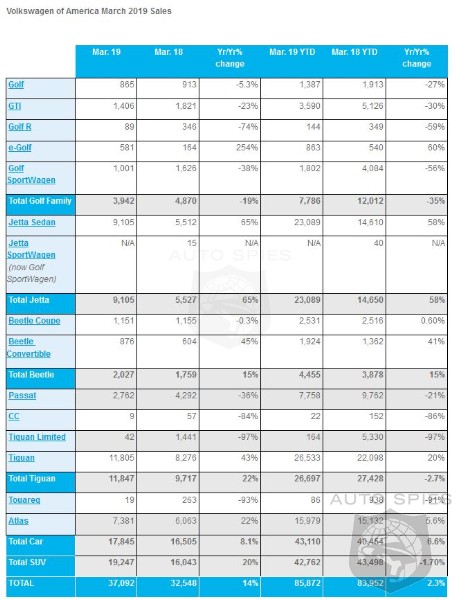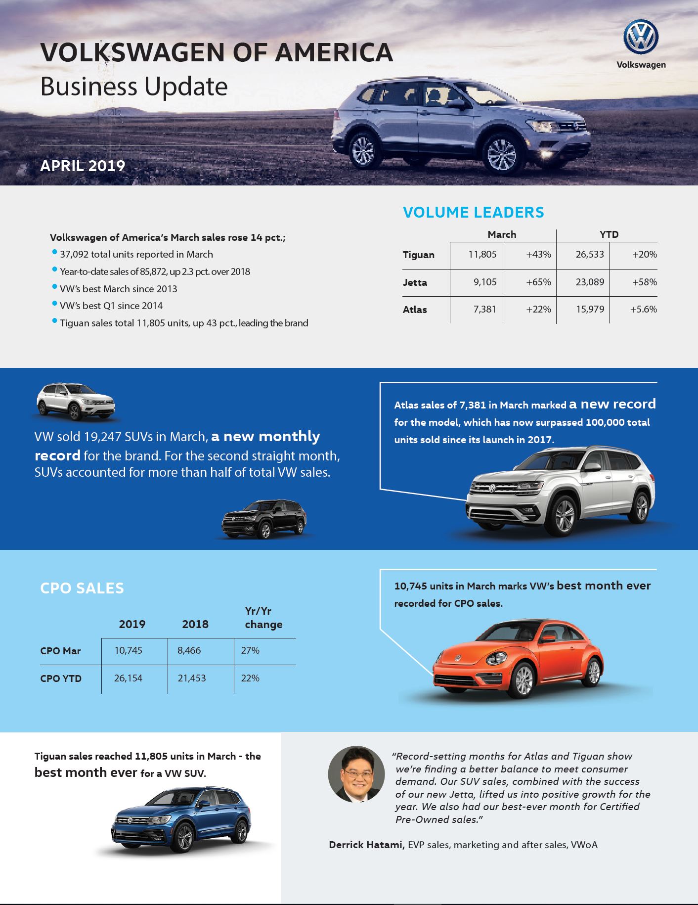 VW sales rose 14% in March powered by robust Tiguan SUV and Jetta sedan sales.