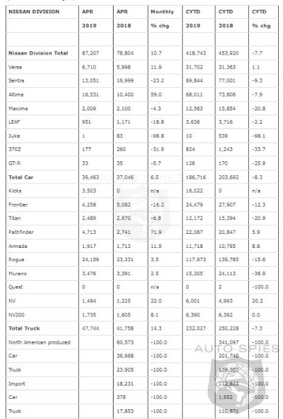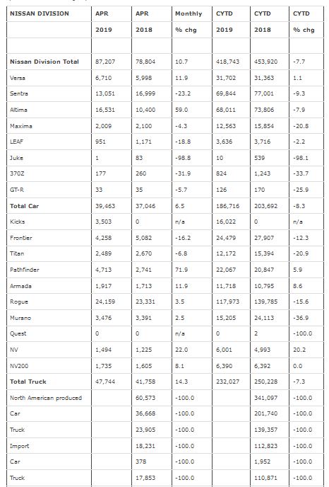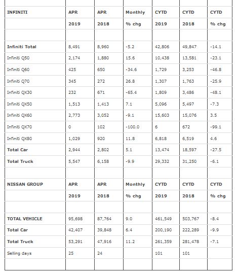 Nissan Group announced total U.S. sales for April 2019 of 95,698 units, an increase of 9 percent compared to the prior year. Nissan highlights:
