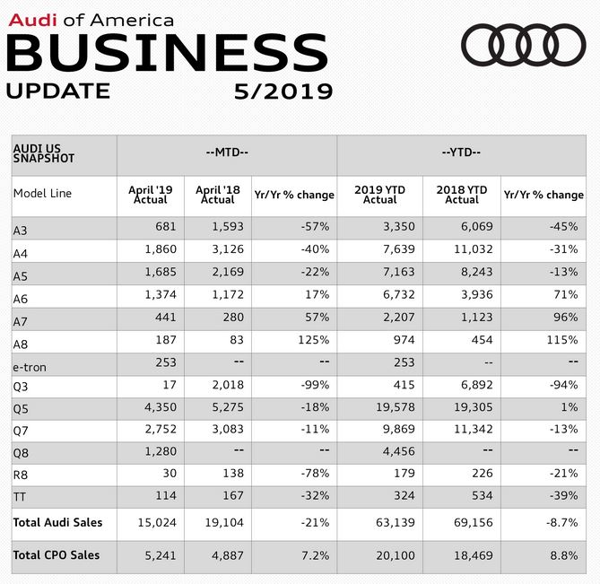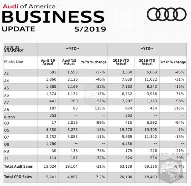 Audi didn't have a lot to say this month, other than they are celebrating their 50th year in the US with a 21% sales DECLINE in April.Read this and weep friends: