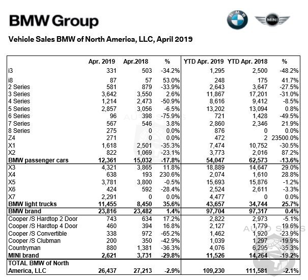 Sales of BMW brand vehicles increased 1.4 percent in April 2019 for a total of 23,816 over the 23,482 vehicles sold in April 2018.