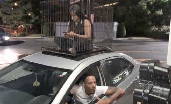 Clearly a prank video or done for comedic effect, two people decided to have a bit of fun with a drive-thru window of their local McDonald's. Behind the wheel was a man. On top of the vehicle inside a carefully placed cage was a woman.