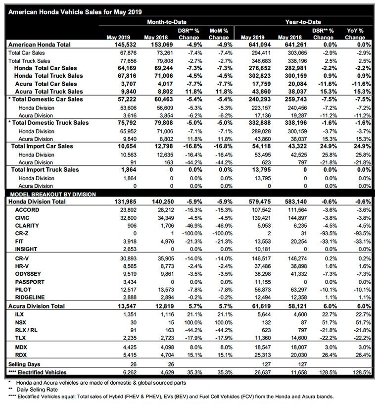 - Civic sales topped 32,000 in May as it continues to dominate compact sedan sales, with Accord contributing another strong month on sales of over 23,000 units.