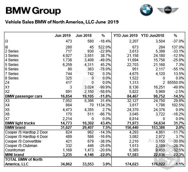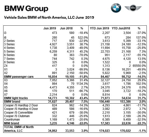 Sales of BMW brand vehicles increased 7.5 percent in June 2019 for a total of 31,627 over the 29,407 vehicles sold in June 2018. Sales of the Spartanburg, SC-built BMW X3 Sports Activity Vehicle topped 7,000 (7,052) units in June, nearing record levels, and driving BMW brand sales to their fifth consecutive month of growth. Other notable performers in June included the X5 Sports Activity Vehicle (4,473), X7 Sports Activity Vehicle (2,214), 3 Series Sedan (4,927) and 5 Series Sedan (6,259).