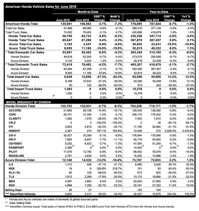 Electrified vehicle sales again topped 5,500 for the month, with Insight and Accord Hybrid both posting retail sales of more than 2,000 units.