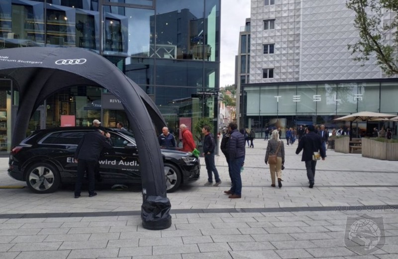 ...An image of Audi’s more assertive e-tron push was posted online by electric vehicle enthusiast Provotroll1, who shared a photo of the all-electric SUV being marketed in front of a Tesla store in Stuttgart, Germany. Based on the image, the e-tron appeared to be attracting some attention from passers-by, with several people checking out the vehicle.