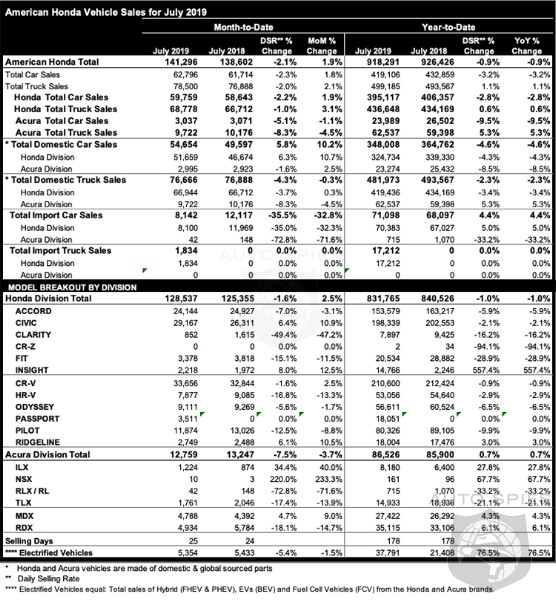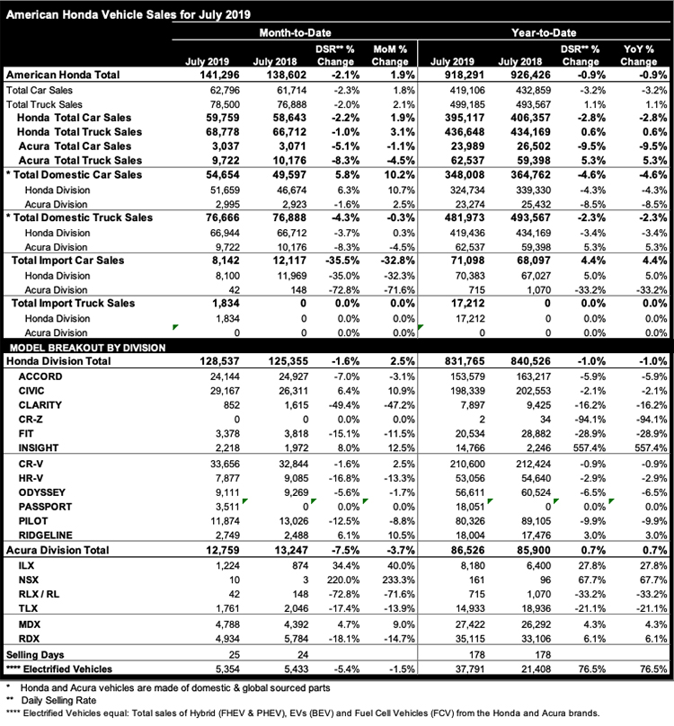 Honda trucks set a new July record, gaining 3.1% from strong performances across the lineup. Honda cars also delivered in July, with Civic gaining in double-digits, Accord topping 24,000 units and electrified models exceeding 5,000 sales.
