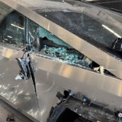 A semi-truck reversed into a Tesla Cybertruck, which was parked at a loading doc...